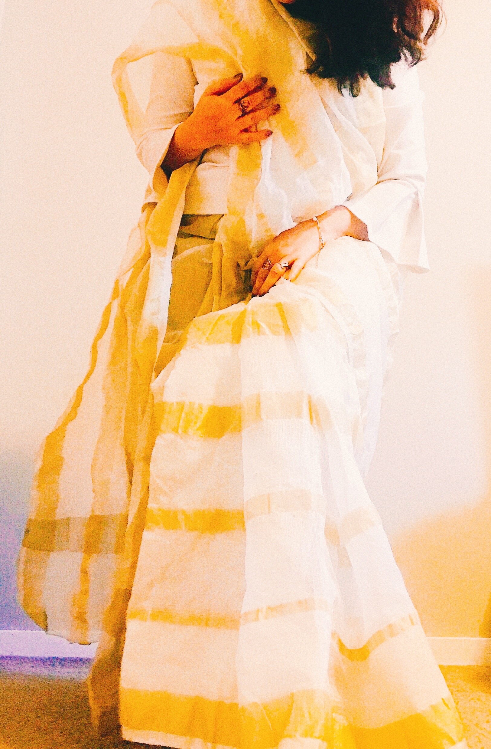 Another addition to your wardrobe is a beautiful silk saree( Indian heritage) or a soft silk shirt. So I opted for a saree, nothing conveys the message stronger than a traditional, nine-yard draped around your body. A silk saree whether a Patola, Banarasi, Jamdani or Chanderi, is the perfect attire to flaunt my Indianess at festivals or social do’s. Also, a silk shirt in any shade/hue will do wonders when complementing with a pencil skirt or simply with formal trousers. Silk is a beautiful cloth.